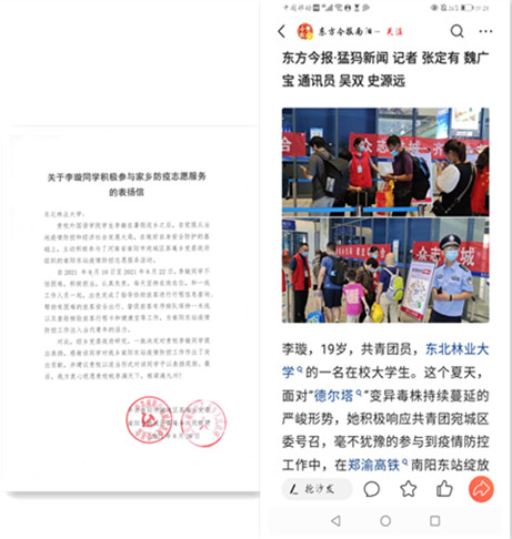 李璇同学优秀的志愿者事迹感动了茶庵乡党委及人民政府并受到了表扬,地方政府赞许她“积极担当”、“认真负责”,“展现了当代青年的活力”。与此同时,李璇同学志愿服务的身影也频频出现在东方今报、今日头条、南阳新闻联播、南阳日报等多家媒体平台上。李璇同学将“东林精神”用自己的实际行动得以诠释,她优秀的表现更展示了东林学子蓬勃奋发的朝气面貌。